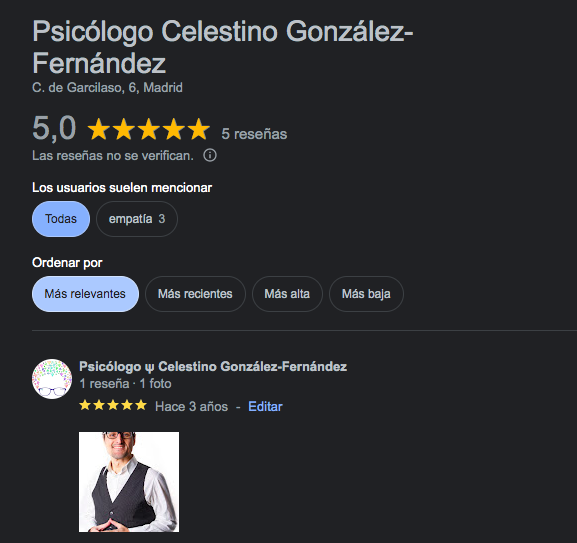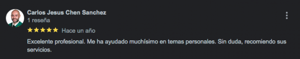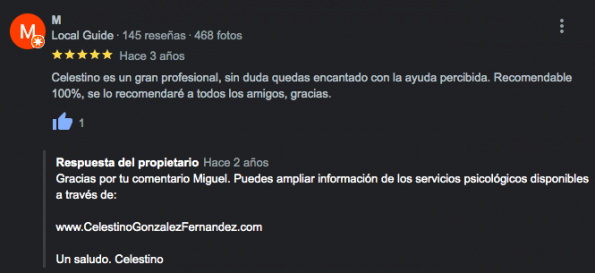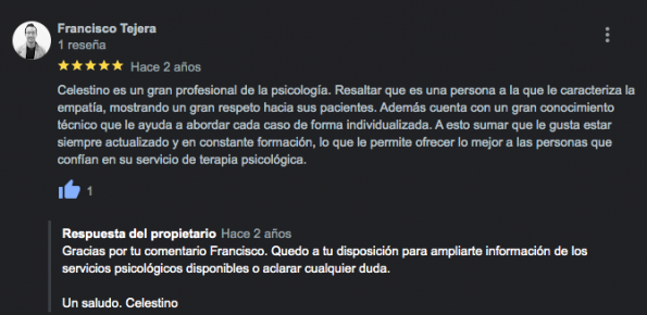 - Paciente 001-D: «Celestino ha sido capaz de plantearme cuestiones clave que me han ayudado a identificar mis áreas de mejora y me ha ayudado a verbalizar muchas de mis inquietudes. Profesional tenaz, muy metódico y con una gran orientación hacia las personas. Empático y capaz de asumir como propias mis metas. Sin ningún atisbo de duda, lo recomiendo como acompañante en tu terapia.»