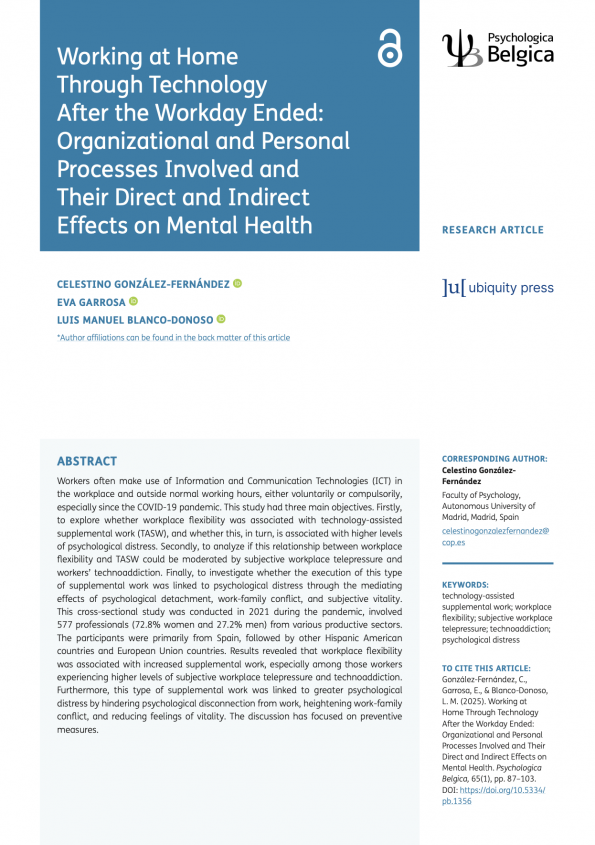 - En el mes de abril de 2025, la revista científica Psychologica Belgica (Q1) ha publicado el artículo artículo que he elaborado con los docentes e investigadores de la Universidad Autónoma de Madrid (UAM), Eva Garrosa y Luis Manuel Blanco Donoso, con el título: Working at Home Through Technology After the Workday Ended: Organizational and Personal Processes Involved and Their Direct and Indirect Effects on Mental Health.